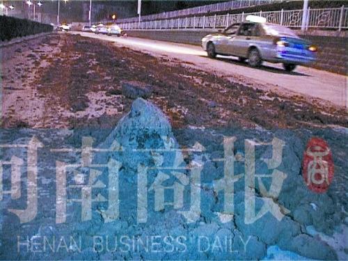 昨日凌晨2点,郑州市未来路石化路桥下南侧,途经此地的渣土车“吐”了一路。长百余米的路面上撒满泥土,还“点缀”着水泥块、沥青块。