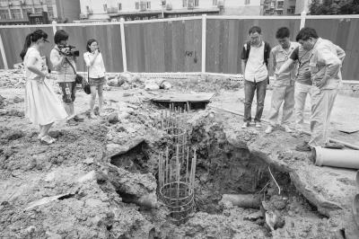 在工地西边一角,记者看到有两个直径约半米的深坑,在其中一个深坑里面,距离地面2米的位置,露出了2根蓝色管道,管道碗口般粗,其中1根已经断裂了,三四名工人正围在深坑边商量处置办法。