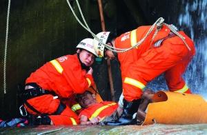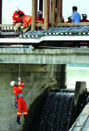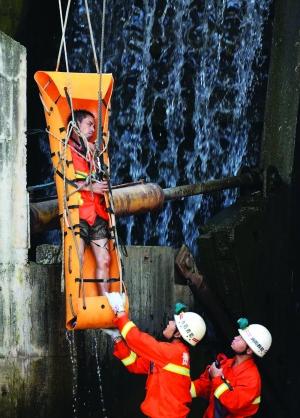 “只能从风雨桥上绳降,然后将他救起来。”据此,两名消防官兵携带安全绳、肢体固定气囊等救援工具,相继从河堤上方绳降。在检查询问环卫工人的伤情后,两人将其抬上肢体固定气囊,固定好后,成功将其拉至风雨桥上。整个救援工作耗时40分钟。