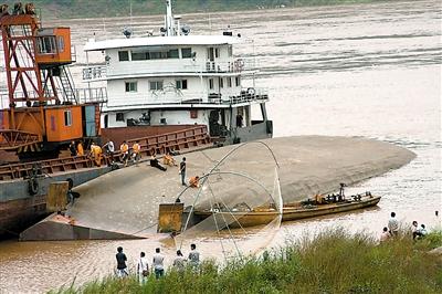 他起身打开手电筒,发现不远处的一运沙船前端,大部分已经沉入江中,两名站在船头上的船员吼了一声:“船遭了”!