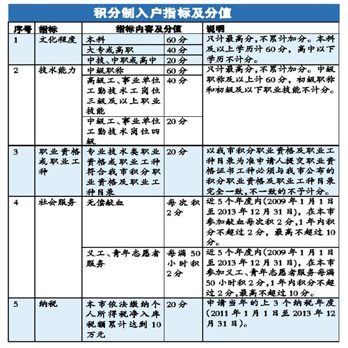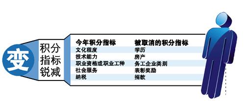 今年的积分指标及分值只设有“文化程度”、“技术能力”、“职业资格或职业工种”、“社会服务”、“纳税”5个项目,取消了原来比拼学历、房产、务工企业类别、表彰奖励、捐款等项目,比过去11大项明显减少。