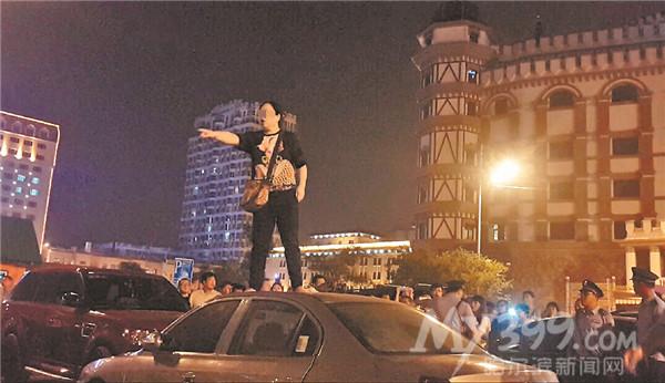 中年妇女赤脚登车顶讲述女儿遭遇。