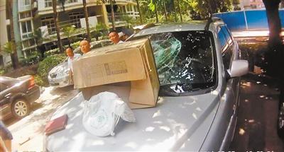 从21楼坠下的箱子、铁锅、书本等物品,砸伤了停在楼下的车辆。(见习记者 景然)