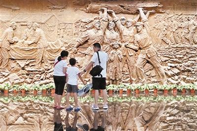 7月27日,在抗震浮雕前,父母向孩子讲述当年“一方有难、八方支援”的抗震故事。