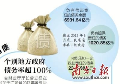 省财政厅厅长曾志权在作《关于广东省2013年省级决算草案的报告》时指出,截至2012年底,全省总债务率为59.41%,低于国际货币基金组织确定的债务率控制标准90%-150%,处于较低水平。截至2013年6月底,我省省市县三级政府负有偿还责任的债务余额6931.64亿元,负有担保责任的债务1020.85亿元,可能承担一定救助责任的债务2212.88亿元,债务规模相对可控。