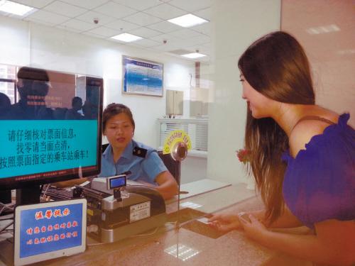 7月29日9时,体验者薛全来到沈阳站售票厅购票,此时,窗口前只有10多位旅客在排队,她较迅速地买到了沈阳站到苏家屯的车票。薛全介绍,平时10时以前、19时以后购票人较少;另外,到沈阳站西广场购票的人少,所以到西广场购票会比东广场快捷。