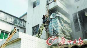 出租屋起火男子被困三楼 消防官兵用挂钩梯救人
