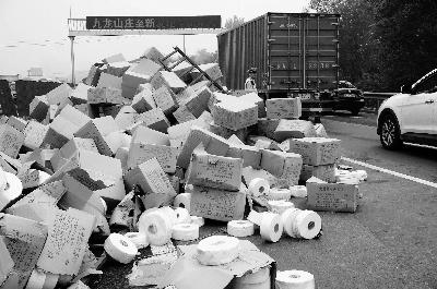 上午9时,记者赶到事故现场,侧翻车辆已经被拉起。正值早高峰时段,进京车辆较多,侧翻车辆停在高速路边。交警拉起警戒线,在路边疏导交通。堆在地上的卫生纸箱大约有2.5米高,暂时没有被清理。