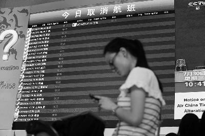 误了 首都机场T3出发大厅电子大屏显示今日取消航班 摄/法制晚报记者 林晖