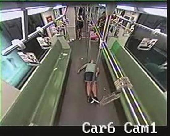 监控视频截图显示,空荡荡的车厢中只剩晕倒在地的老外(资料图片)