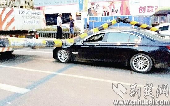 限高梁被撞断砸中百万新宝马 幸无人员伤亡(图)