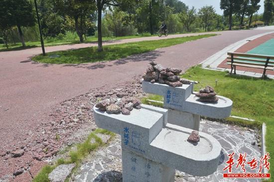 8月20日,长沙市潇湘大道柏家洲段,直饮水台上被人堆放了碎石块,水龙头已不见踪影。记者 田超 摄