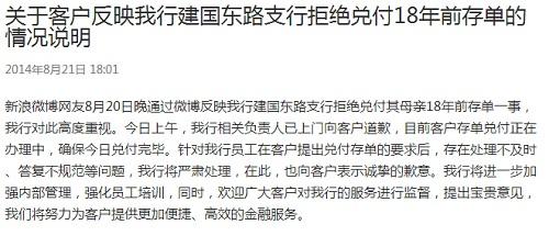 记者发现,此前在微博中反映“存款单超15年不承认”的当事人,也于昨夜发布微博,称徐州中行工作人员已登门三次,很诚恳的就此事表达了歉意。(李楠楠 刘碧瑶)