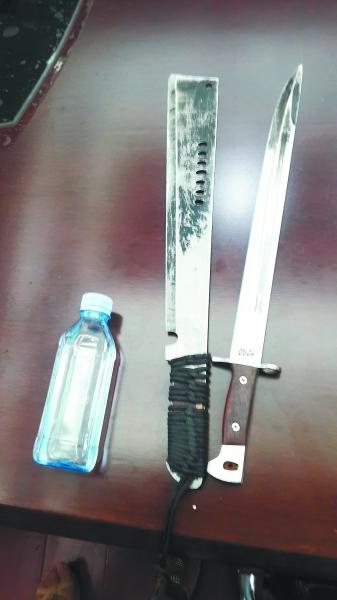 当事民警王刚勇介绍,前天下午5点左右,他得知情况赶到铁路小区时,并没有看见持刀男子。四处寻找,他在小区内的窄巷内看见一名身着黑色夹克的中年男子,夹克领口处有明显鼓起,似藏有硬物,十分可疑。因对方拒绝查看衣服内的物品,无奈之下,王刚勇只得和协警杜明昌一同上前拽住男子的胳膊将其制服,在皮夹克内搜出两把管制刀具。在警务站,记者看到了民警缴获的两把刀具,一把为45厘米长的军用刺刀,另一把为40厘米长的砍刀。