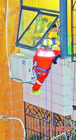 救援人员在27楼将两名战士放至24楼的遮雨棚。