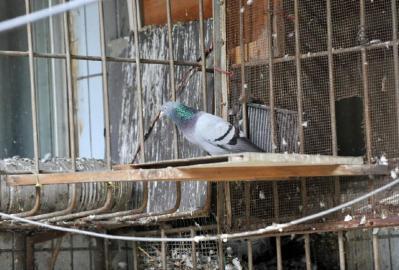 让毛先生伤脑筋的除了狼狗,还有一群鸽子,它们的窝就在狗窝上方的空调架里,铁栏上挂着散落的羽毛,粪便铺满了附近的地面,沾在防护栏上。毛先生说,管女士搬进来不久就养起了鸽子,最初只有两三只,可后来繁殖得越来越多,到今年已经十多只了。