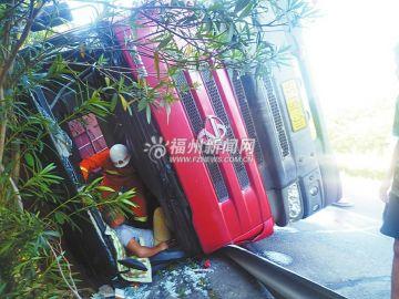 昨日15时50分许,一辆大型货车在福厦高速公路兰圃路口侧翻,货车驾驶员被困。
