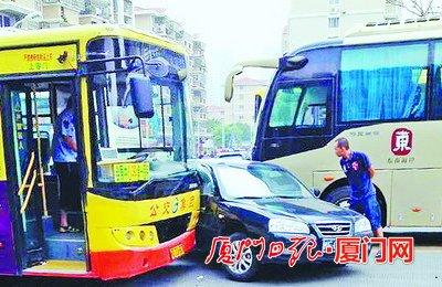 一部公交车与一部大巴车横在马路中,中间还夹着一部黑色小轿车,在路口做“夹心饼干”状。前天上午8点45分左右,前埔东路岭兜二里路口处发生三车刮撞事故,所幸没有造成人员伤亡。