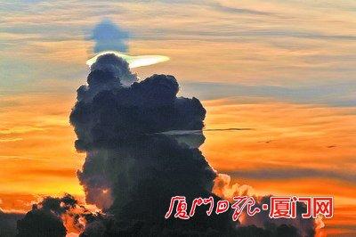 昨日18时许,不少市民在西面的天空看到了这样一幅奇景:在一团浓云的顶端,停驻着一艘“飞碟”,闪着金光,格外瑰丽动人,片刻之后,墨染一般的云团渐渐将“飞碟”吞没。这是“飞碟云”继8月5日现身厦门之后又一次璀璨亮相。这种少见的气象奇观,在半个多月内两次在厦门出现,令不少人啧啧称奇。