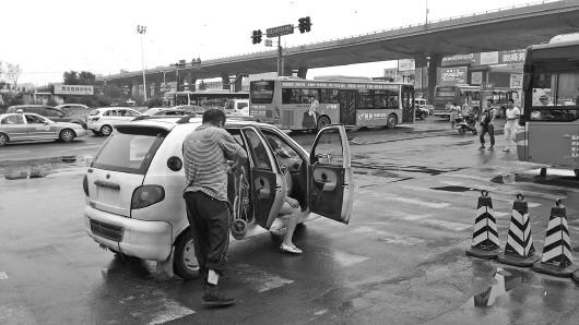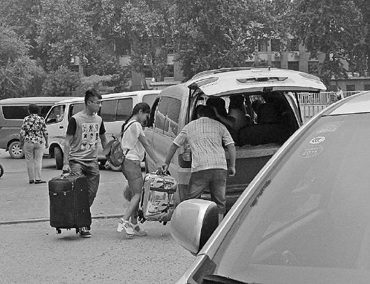 在济南洪家楼,两名学生搭黑车回学校,司机帮忙把行李箱装上车。 本报记者 韩笑 摄