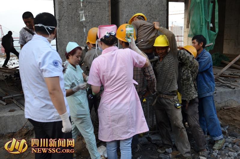 消防官兵到达现场后,发现一名工人被悬空挂在几根直径2.2厘米的钢筋上,钢筋从下方直接插入了工人臀部和大腿,正发出痛苦的呻吟声,几名工友用肩膀顶着木板搭起承重桥托举着受伤工人,以减轻其痛苦。此前赶到现场的医护人员正对该工人进行输液、吸氧等紧急处置。