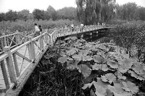 在通州大运河森林公园的湿地旁,芦苇摇曳、荷花怒放。杨根萌称,通州区运河的水面约为47公里,占北京的近六成。“目前我们已经完成了四分之一的保护工作,森林公园中10公里的大运河河道周边有湿地。第二步我们将进行漷县延芳淀湿地公园改造,第三阶段,通州所有运河的水面都将进行湿地保护。”他说,目前运河通州段的水面平均宽200米,部分达到300至400米宽。