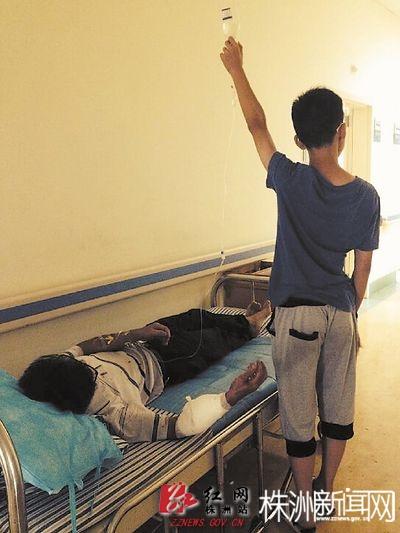 在中心医院住院部的16楼,记者见到了躺在临时病床上的熊先生。经过简单的急救后,他边打点滴边等待下午的手术。他右手被白色纱布缠绕着,黄色的条纹衣服上满是血迹,脚上同样血迹斑斑。