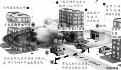 记者看到,发生爆燃的12号楼其南侧、东侧的居民楼有多处玻璃窗被震碎,楼下地面遍布着玻璃碎片。其北侧一间公厕距爆燃点最近,塑钢窗已变形,公厕内遍地残骸,已无法使用。爆燃点相邻的左家庄北斜街,有至少十余辆私家车车窗被震碎,受损机动车距爆燃点最远有20多米。