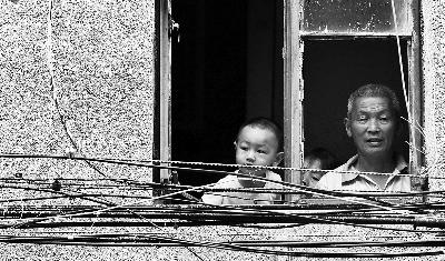 爆炸现场对面的二楼楼道,窗户玻璃被全部震碎,老人带着小孩关注现场救援情况