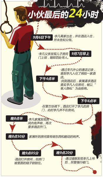 “脖子上套着绳子。”绵阳市涪城区公安分局城北派出所民警苏大海告诉记者,当时房门虽然打开了一条缝隙,但由于门内挂上了链子锁,根本不知道里面的情况。“其间,我用手机伸进去拍了几张照片,拿出来仔细一看,才发现有人上吊了,当即破门而入。”苏大海说,与绵州酒店监控核对,民警破门时间为21时21分41秒。最终证实,上吊小伙就是李凡,“120赶到现场后,抢救了10多分钟确定小伙抢救无效死亡。”民警说,目前,此事还在进一步调查中。