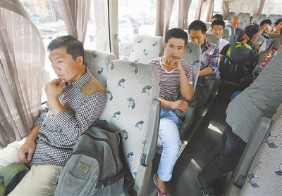 9月9日上午,河北省定州市前往新加坡的打工者在市里集合,在大巴车上,大家表情凝重。劳务公司统一将他们送到北京首都国际机场,搭乘当天午夜的航班飞往新加坡。