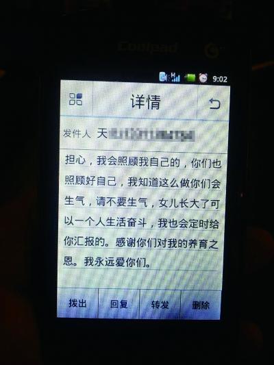 天天失踪后,父母马上赶到北京,并不断通过手机、QQ等方式联系她,但一直没有得到回应。直到9月10日晚9时左右,母亲张女士突然收到女儿手机发来的一条短信。说自己不想依靠父母,长大了要去闯闯,并称找到了一份销售的工作,单位管吃住,让他们不要担心。