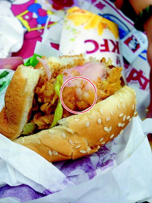 “以前看到过很多爆出肯德基食品问题的报道,自己都没在意。直到今天真的在汉堡里吃出头发才感同身受,现在回想还是觉着太恶心了。”王女士抱怨说:“虽然店方给换了个新的汉堡,但吃到一半就吃不下去了。”