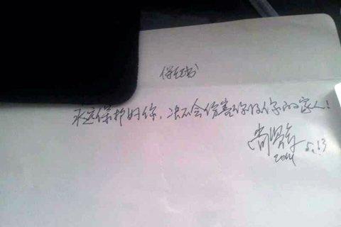 此外,举报人还曝出一份10余字的保证书,写着“永远保护好你,保证绝不会伤害你和你的家人”,文末有“尚某”署名及日期“2014.5.13”。