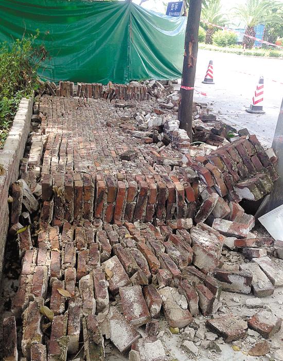 羊城晚报记者在事发现场看到,倒塌的围墙没有地基,是用砂浆砌起来的单片墙。倒塌部分长约50来米,高约2.5米,几乎成片倾倒在人行道上。
