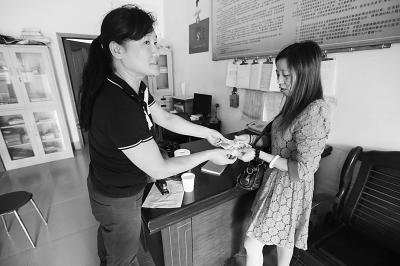 张春芳(图左)将170元独生子女费交给江女士。记者杨涛 摄