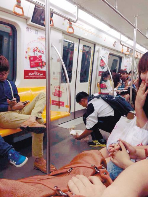 张女士说,当时车厢里的人都被男孩子的举动惊呆了,大家谁都没有说话,也没人上前去帮他一起收拾。张女士和她的朋友当时拿起手机,拍下了男孩子的这一举动。