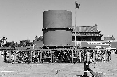 今天凌晨1点左右,天安门广场国庆中心花篮开始进场安装。经过施工方一夜忙碌后,在花篮中起到底座和固定作用的“核心筒”安装完毕 摄/法制晚报记者 刘畅