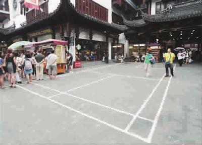 昨天下午,记者来到豫园商城,在华宝楼前的空地上,紧挨“星巴克咖啡”的门口,找到了这块“露天球场”。这是一块羽毛球双打场地,场地线是用白漆刷的,整齐标准。此时,没有人打羽毛球,来来往往的游客纷纷踩在场地线上。