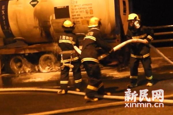 满载易燃易爆化学品的槽罐车起火。上海消防总队南汇支队 供图