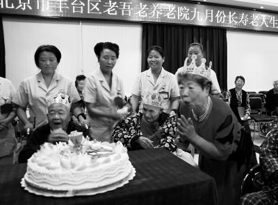 老人们在老吾老养老院内给九月份过生日的老人送上祝福。本报记者 吴镝摄