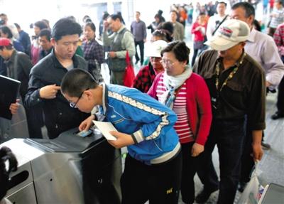 去年5月5日,14号线园博园站,乘客刷卡出地铁。北京公交地铁将实行计程票制,多乘坐多付费。新京报记者 薛珺 摄