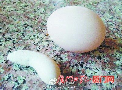 您见过像茄子状的条形鸡蛋吗?昨日,网友@炫歌XM 在微博上晒出几张异形蛋的照片,称是东孚一只鸡的“杰作”。