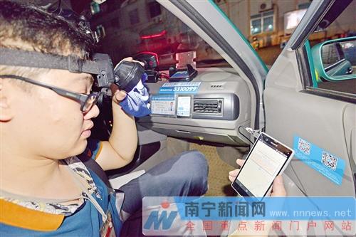工作人员扫描出租车的防伪识别码 记者 段柳健 摄