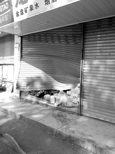 昨日9时,记者赶到该商店。吴先生告诉记者,他已报警,保留现场待警察查看。吴先生的商店位于玉河天桥的东北角,有两间铺面,该商店有两扇门,里面是玻璃门,外边是卷闸门。记者在现场看到,东边的卷闸门完好无损;西边的玻璃门已经破碎了,卷闸门底部凹进去一米,卷闸门的一角被撕扯下来,落在门前。记者注意到,该商店门前一米处有一个高十几厘米的台阶,车要冲上台阶才能撞到店门。记者看到,台阶上确实有两道较深的车轮印。