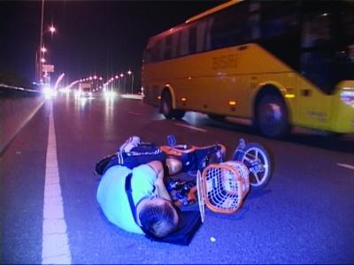 醉汉骑车上高架横卧路面险象环生 好心司机报警