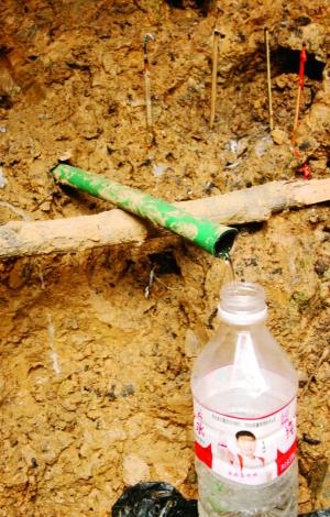 所谓的“神水”,是从一处土坎下的石缝中渗出,被人用一根拇指粗细的塑料管引出,方便装入水瓶。