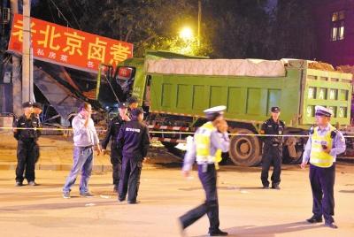 渣土车刹车失灵连撞7车碾死1人 撞塌卤煮店(图)