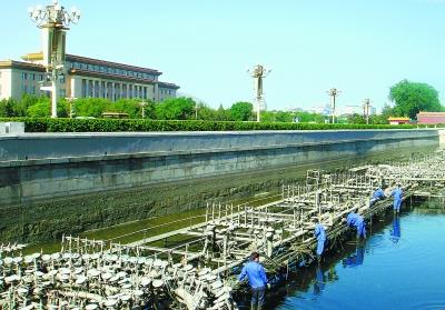 在天安门城楼下的金水河中,工人们正在为音乐喷泉系统更换电缆,以保证国庆期间喷泉系统正常运行。本报记者 和冠欣摄