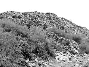 23日下午,北京晨报记者来到平西府村,看到了这座约两层楼高的垃圾山(如图),面积近一千平方米。垃圾山外侧有几块石板围着,其中一块石板上用粉笔写着:“谁倒垃圾,让车撞死!”
